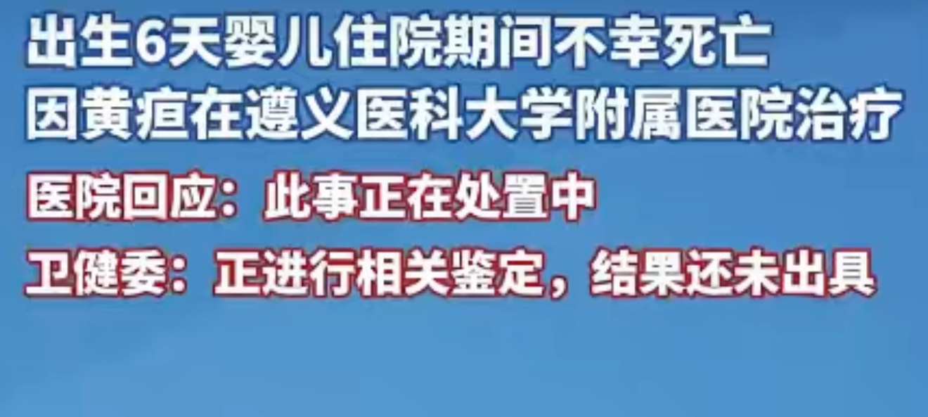 6天大的小生命还没来得及看清世界,就因为黄疸永远闭上了眼睛。10月22日凌晨,遵义医科大学附属医院新生儿科传来令人心碎的消息——一名出生仅6天的婴儿在蓝光治疗期间突然离世。这个本该被全家捧在手心的宝贝,还没学会喊第一声“妈妈”,就这样在监护仪的警报声中停止了呼吸。