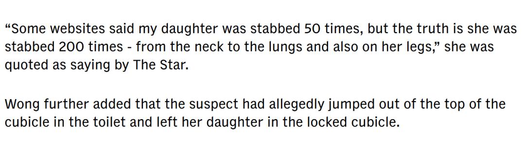 “一些报道说我女儿被刺了50刀,但事实是她被刺了200刀——从脖子到肺部,腿上也有刀伤。”