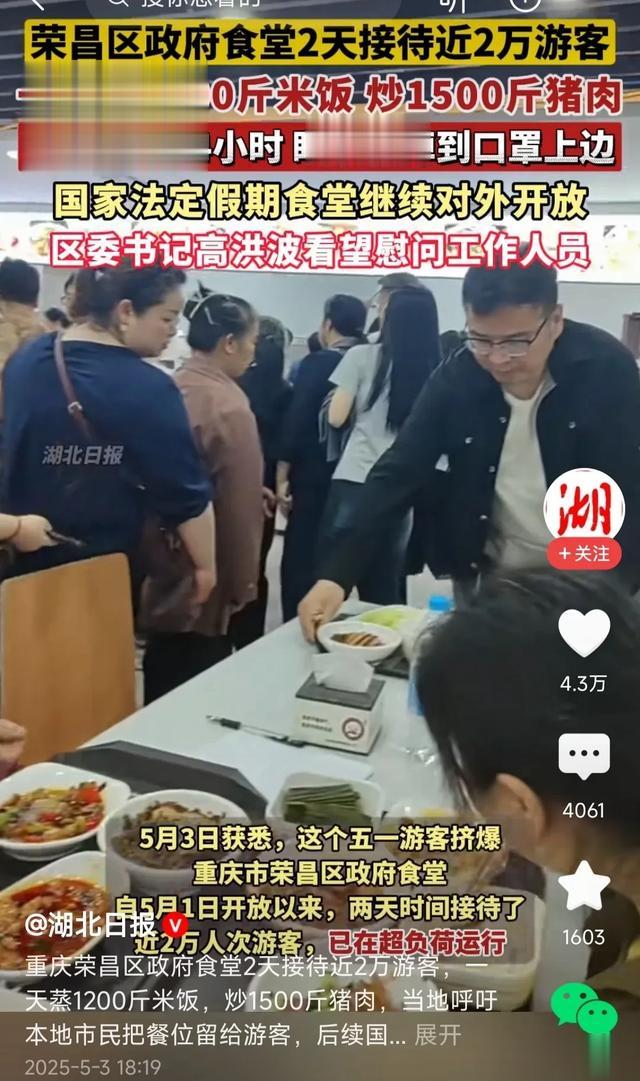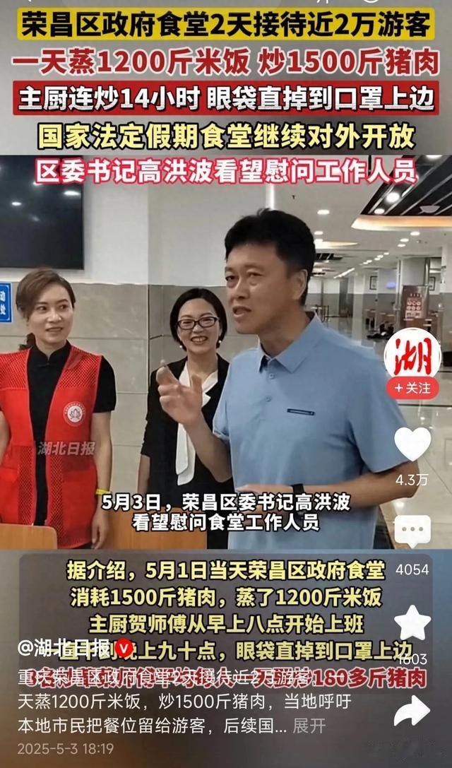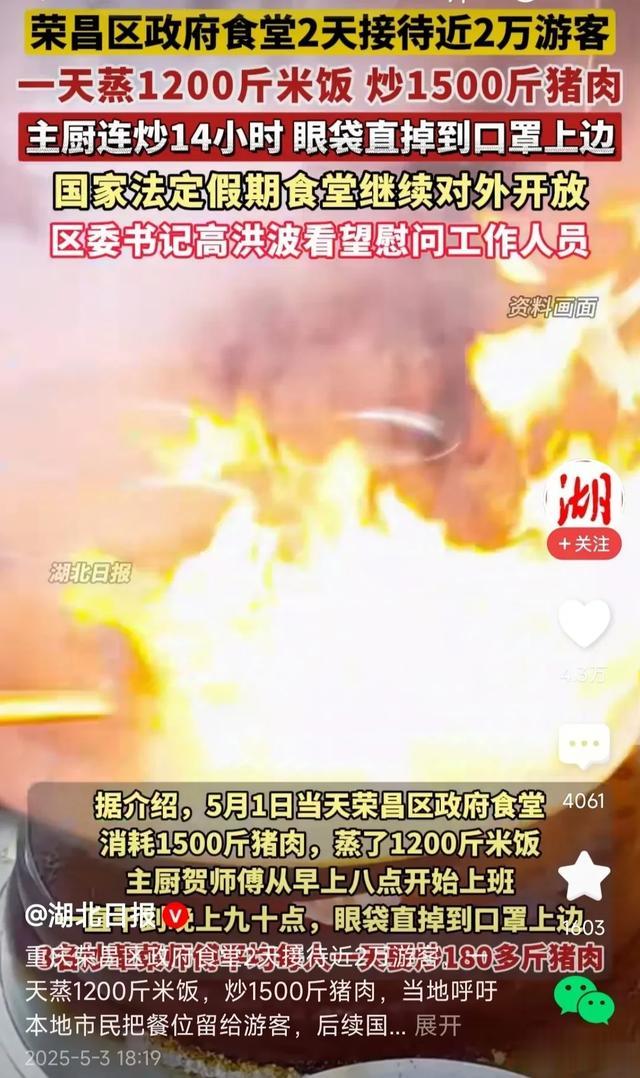 荣昌区政府食堂2天接待2完游客,一天蒸 1200斤米饭,炒1500斤猪肉,主厨师傅从早八点上到晚十点,忙到没时间休息,眼袋都掉到口罩上边了。