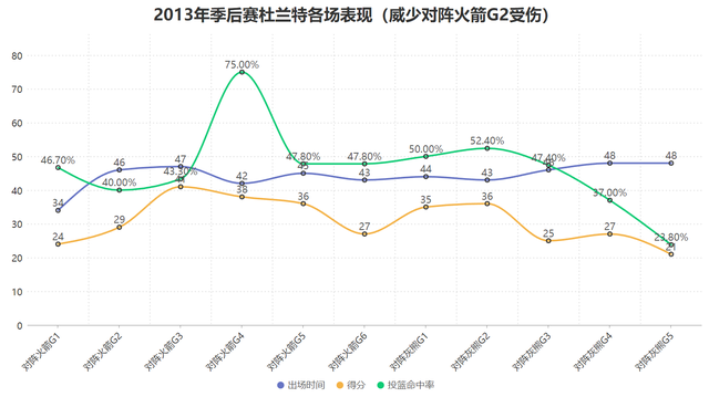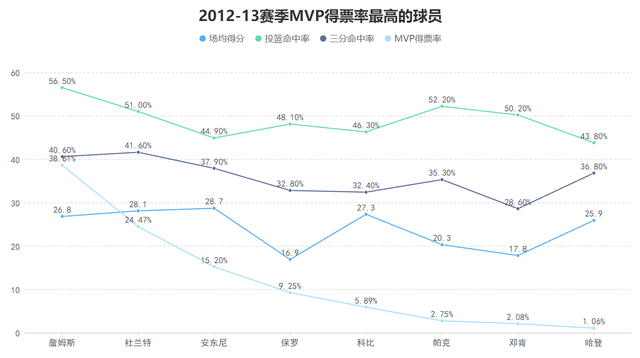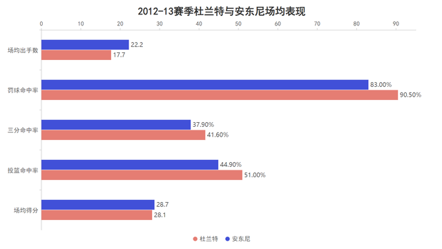 球队战绩顶尖的同时杜兰特的个人表现也极为精彩,虽然他本赛季的场均得分为28.1分落后于安东尼,但从得分效率上来看杜兰特的三项命中率为51%、41.6%与90.5%,三项命中率达到了180俱乐部,相比之下安东尼的得分效率下滑了一个档次,因此杜兰特虽然无缘连续四届得分王的成就但在这个赛季他的得分能力已经是公认的首屈一指的存在了。