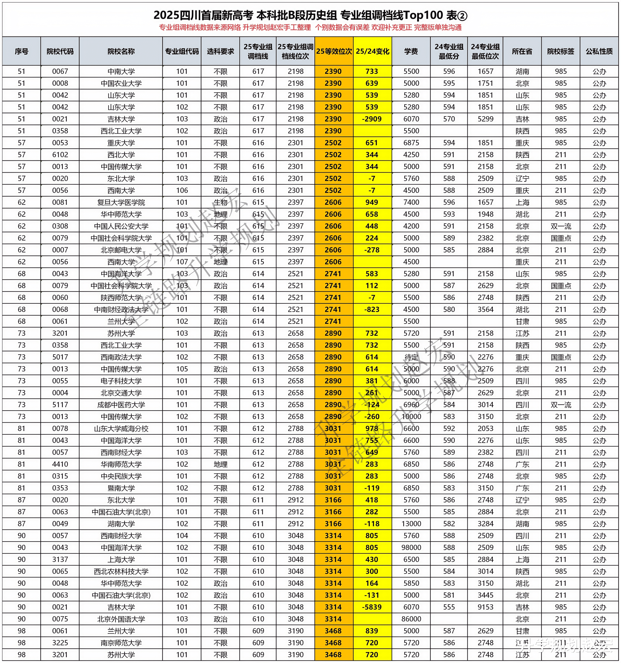 历史组TOP100中,整体变化也是不大的,除了个别的超过2000名外,其他的其实没啥变化。同样这些院校专业组中,排前面的也有一部分211,还有双一流,同样这些211也是行业院校的优势热门专业组,所以大家的趋势也非常明显了。成都中医药大学101组排在73位,这个专业组包含中医学(李斯炽班)、中医学(5+3一体化)、中医学(5+3一体化,儿科学)。历史组前100中,211的院校也多起来了。兰州大学、西北农林科技大学、吉林大学等院校在100的位置。西财、北外、上海大学等院校也在这个区间。实际上真正的纠结就在这个区间开始。前面的纠结其实没有那么大。但是这儿不能简单的用分数位次去比对,长远路径规划才是核心。