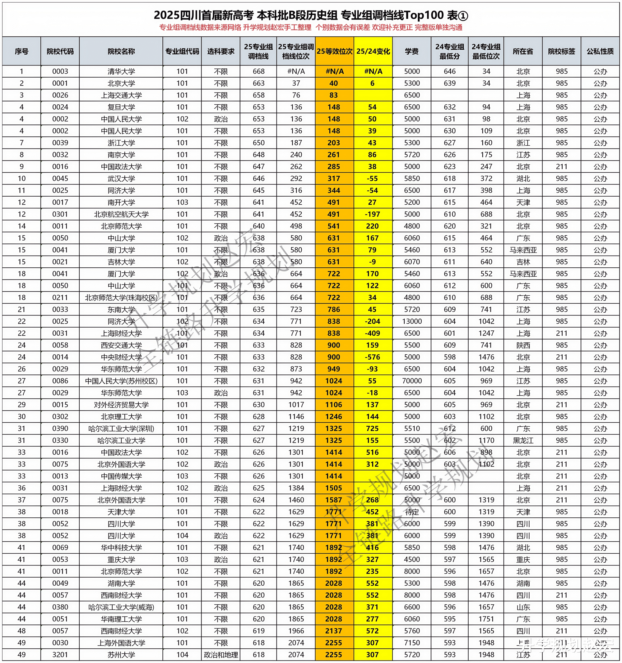 看内容之前还要说一个前提,四川2025年的高考院校专业组没有统一公布,只有考生在填报系统里面查看自己的填报过的院校专业组,才能看到这样的调档线。我们花了大量的时间和精力去收集整理,并且全部的数据是手工加工处理,这就会导致数据会有错误的地方,以及获取数据的来源也会有错误的。截止写文的这个时间,本科批B段和专科批调档线数据已经整理完成,后面也会不断去更正。也欢迎大家知道数据的,去补充和更正,感谢大家。同样分析咱们近期也会写录取数据分析报告,感兴趣的可以单独沟通。