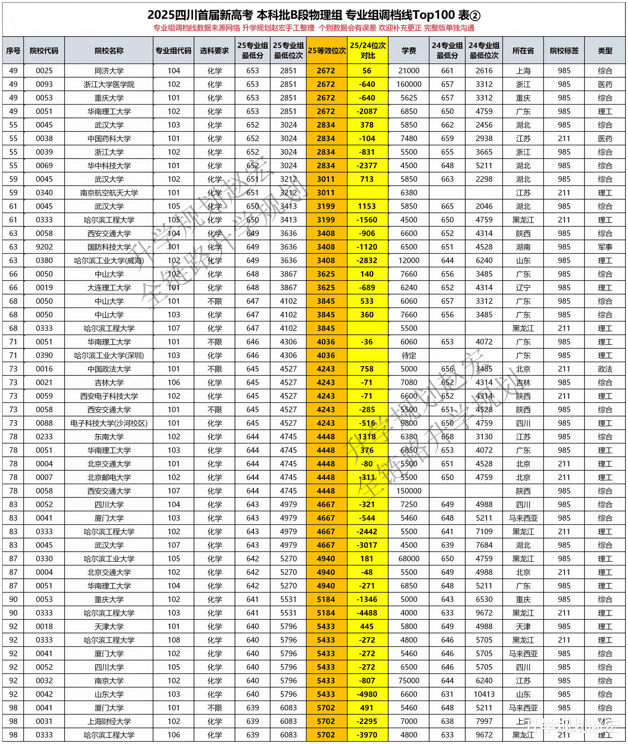 本科批B段物理组top100中,院校专业组分数最低的哈尔滨工程大学106组、厦门大学103组、上海财经大学102组,都是639分。哈工程106是通信工程(兴海领军)专业,上财是人工智能、统计、数学等专业,前100中有多个211大学的优势专业组,这个就是专业优先的结果,能进前100的基本上也是行业院校。其他的基本上就是985院校层次,尤其头部的985大学变化不大,一个原因是招生专业是大类,很多是超大类,其实就没啥可以选择的了。第二个原因就是头部院校的转专业政策越来越开放,并且把这些政策放到招生宣传中。再加上填满几个保几个专业。那么基本上就没有多大的变化。第三个就是大部分还是看重院校层次的,中间分数段和低分段的逻辑是不一样的。大家看看位次变化就知道了。整体几百一千的位次变化可以忽略。