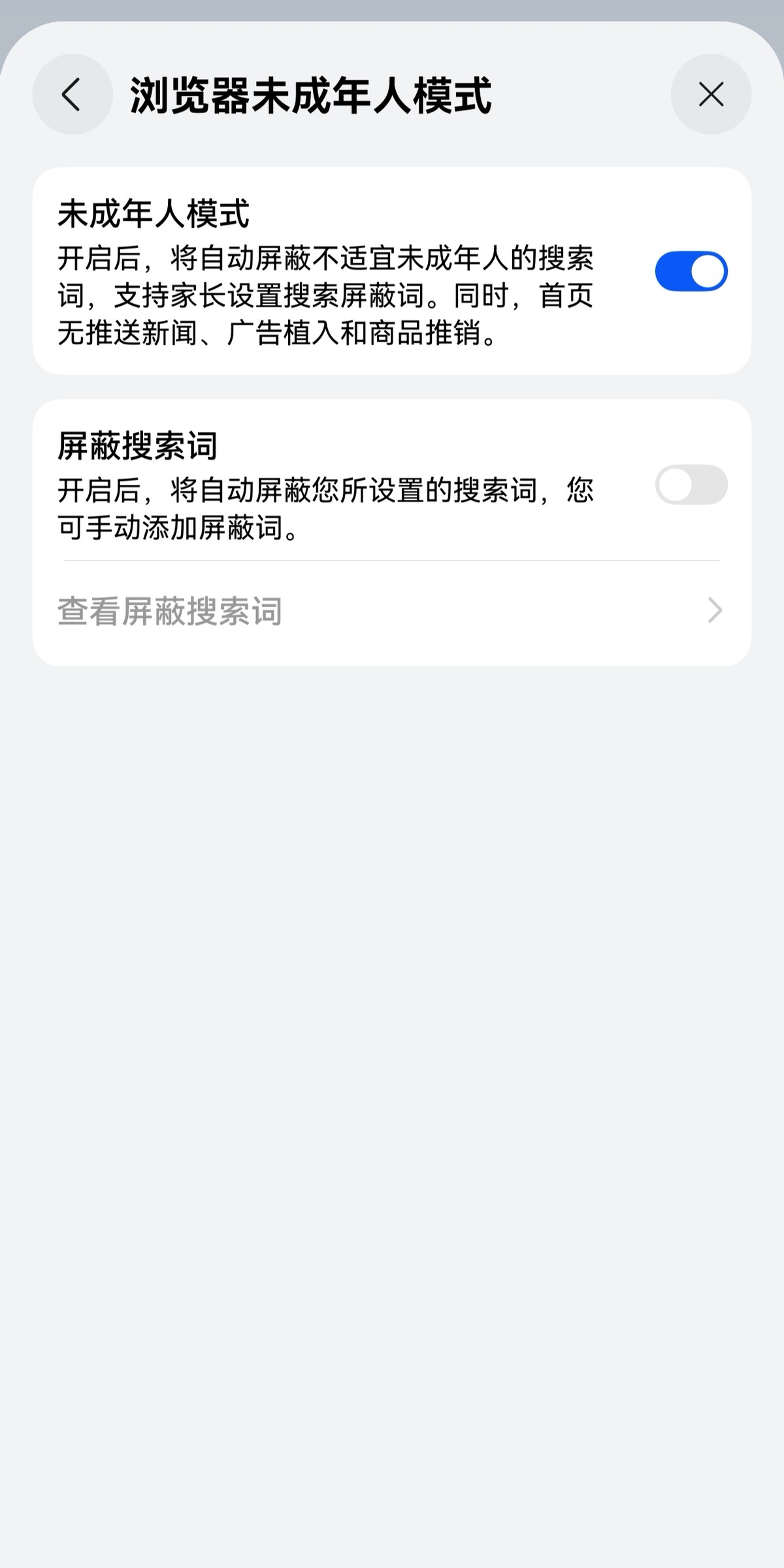 有孩子的家长还可以给手机再上一道锁,华为浏览器还提供未成年人模式,可以及时检索并屏蔽涉黄、暴力等少儿不宜的内容,并支持屏蔽搜索词功能,可自动或家长手动添加搜索词,,防止孩子在搜索资讯内容时接触到不适宜信息,帮助家长“监管”未成年人上网的安全问题,保护儿童身心健康。