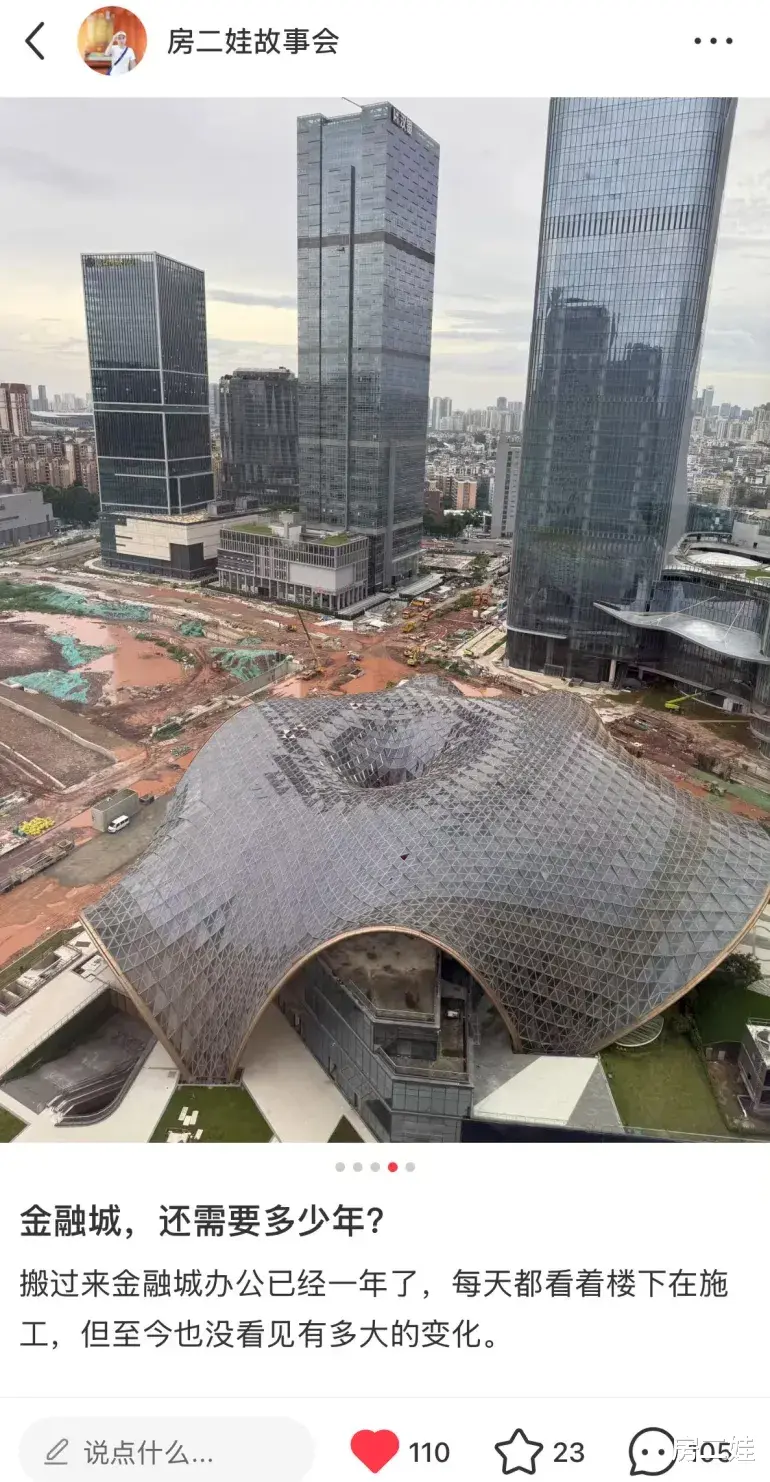 来的时候,楼下是一片大工地,如今还是一片大工地,进度确实有点慢了。以至于我在小红书上发了一篇疑问帖,叫做:金融城,还需要多少年?