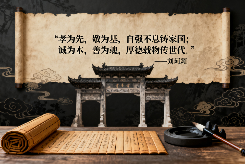 18.孝为先,敬为基,自强不息铸家国;诚为本,善为魂,厚德载物传世代。