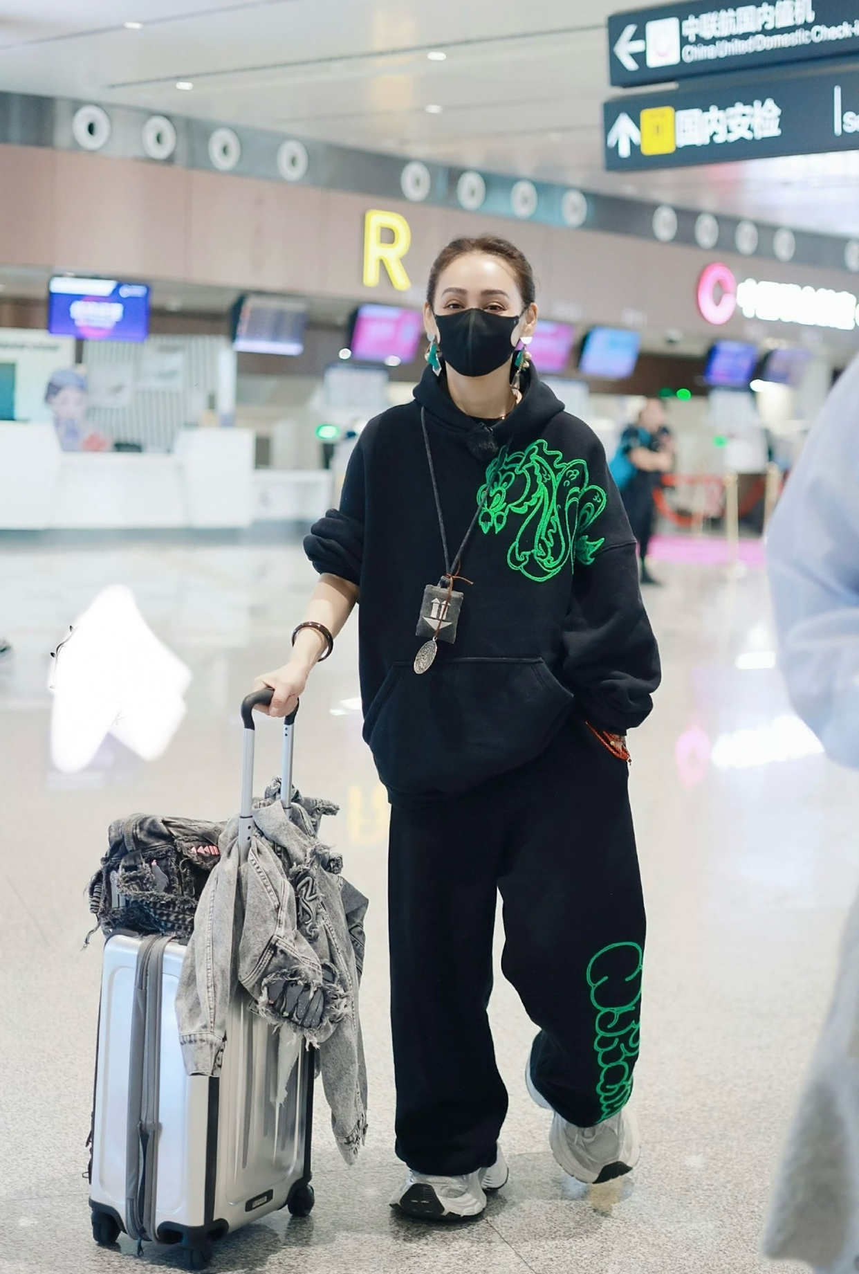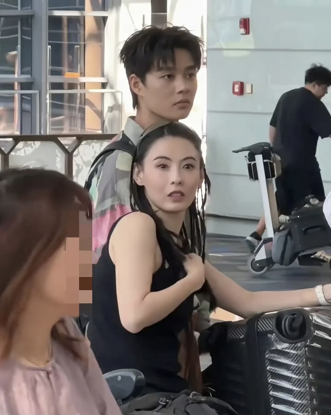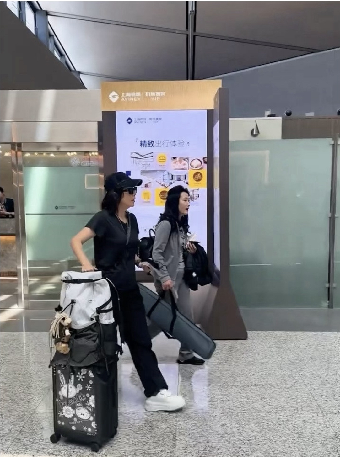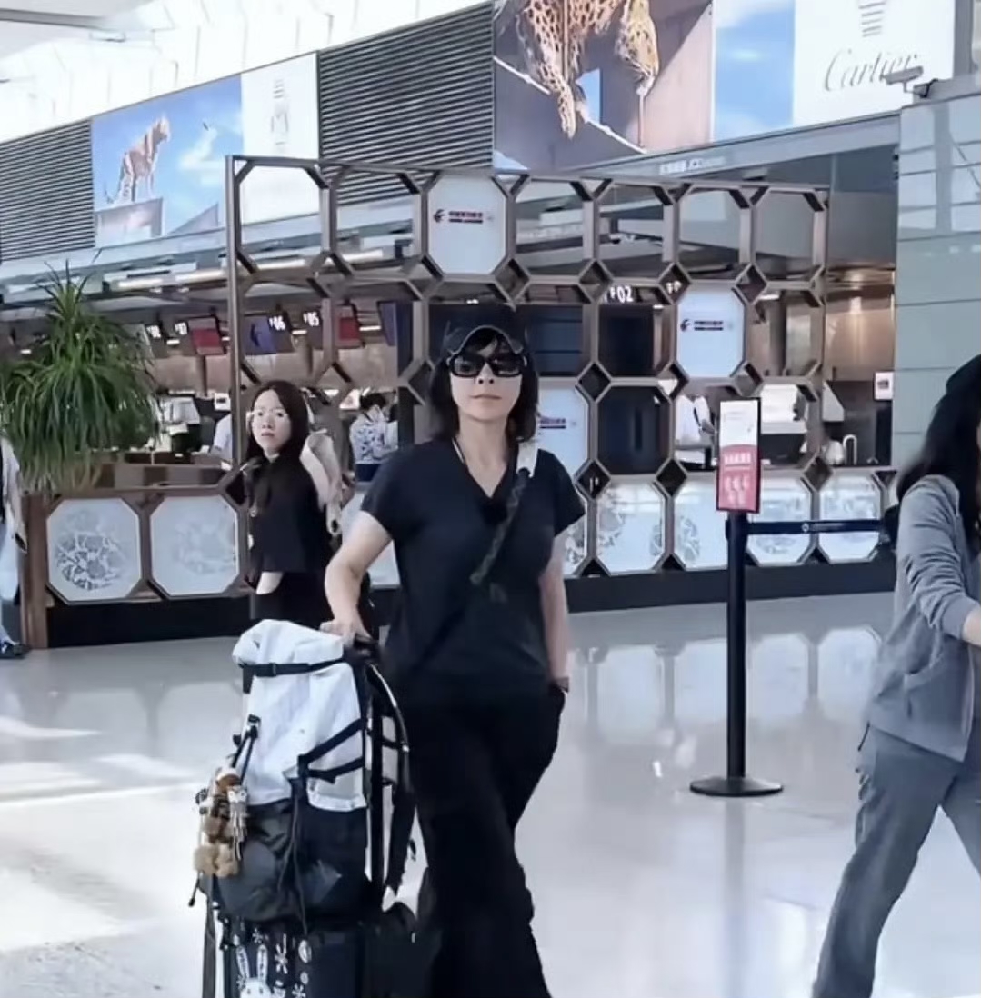 路透中的宁静一身一身全黑,单手插兜,单手推行李箱看起来真的太酷了。