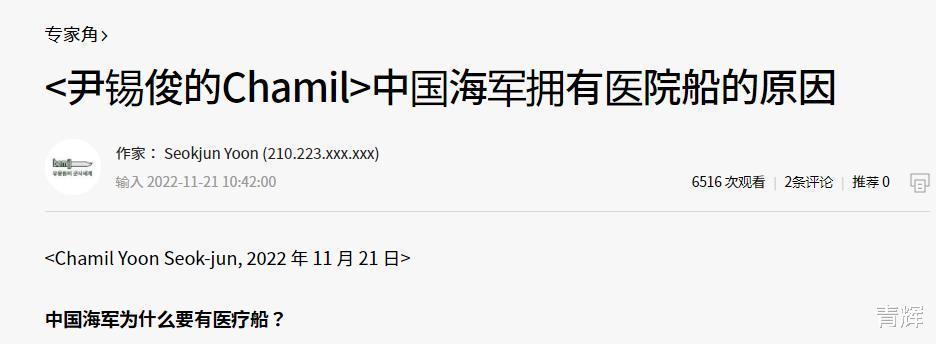 而近期,青辉在韩国媒体《朝鲜日报》之中,看到了对于中国海军医疗船的报道,在这篇文章之中,韩国人以《中国海军拥有医院船的原因》为标题对此事展开了描述。