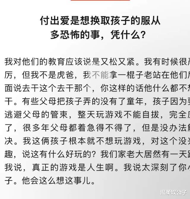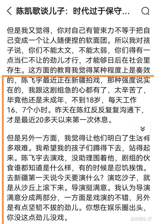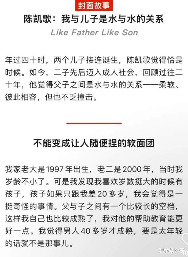 在采访中,陈凯歌非常真诚,聊到孩子的顺从,难道付出爱就想换取吗?凭什么,他希望陈飞宇不能变成让人随便捏的软面团。