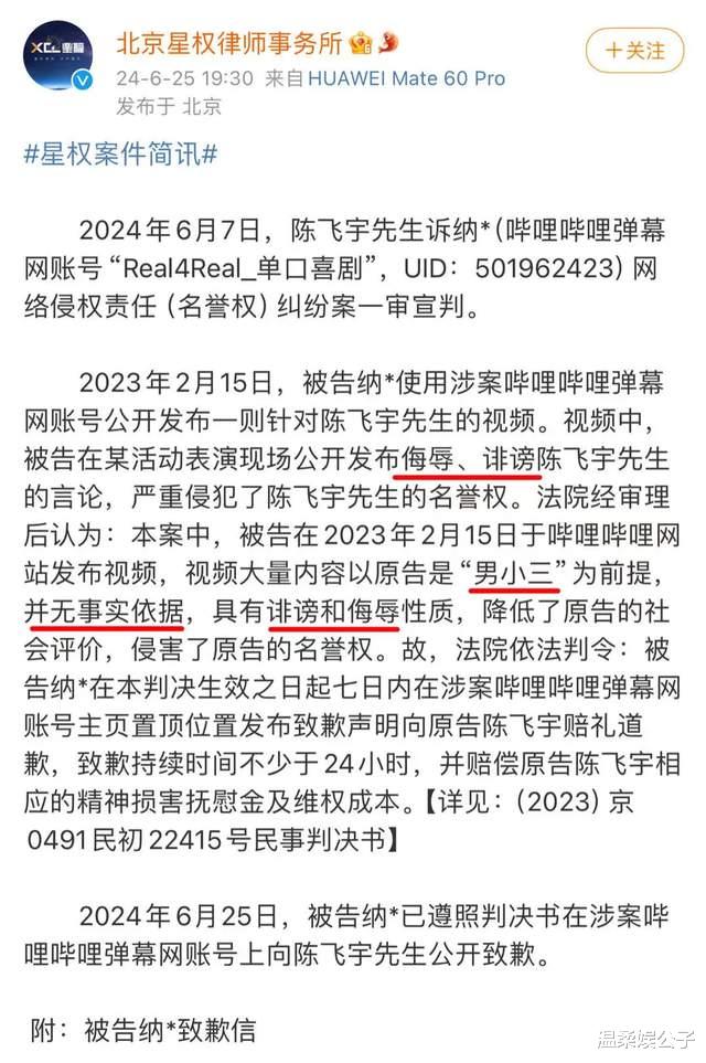 这样家庭成长的陈飞宇,确实让人羡慕又嫉妒,有闯的勇气,也有不怕事的信心,去年,他一纸状告,把泄露个人隐私的人告上法庭,对狗仔说不,最终胜利,狗仔后灰溜溜赔偿了15万后公开道歉。