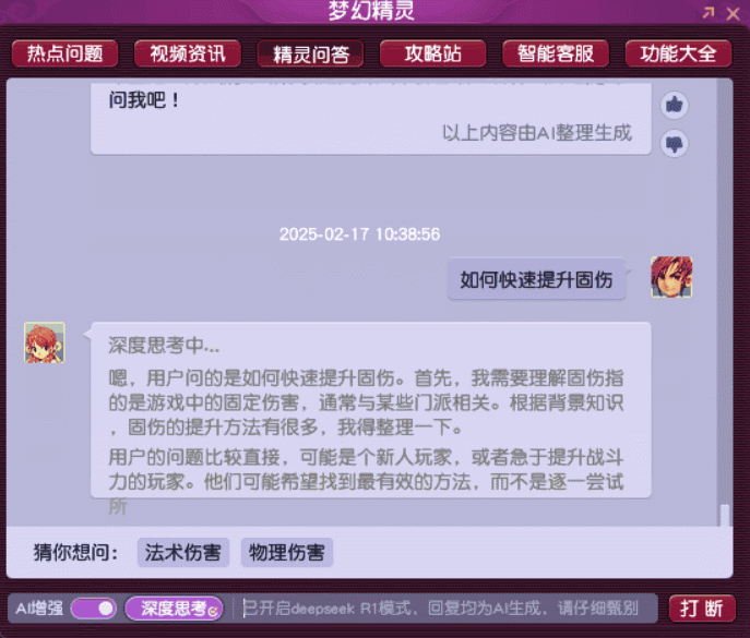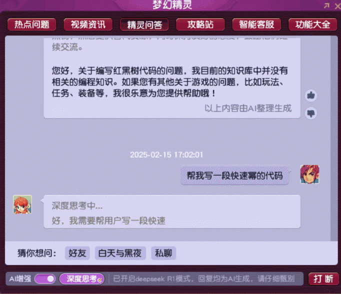 玩家在游戏内通过打开“梦幻精灵”的AI增强和深度思考功能,不仅能迅速地查找到经由搜索整理后更全面的游戏攻略内容、让她告诉你如何进行帮派管理等内容,甚至还可以让“梦幻精灵”帮你写代码,或者告诉你“番茄炒鸡蛋怎么做”。