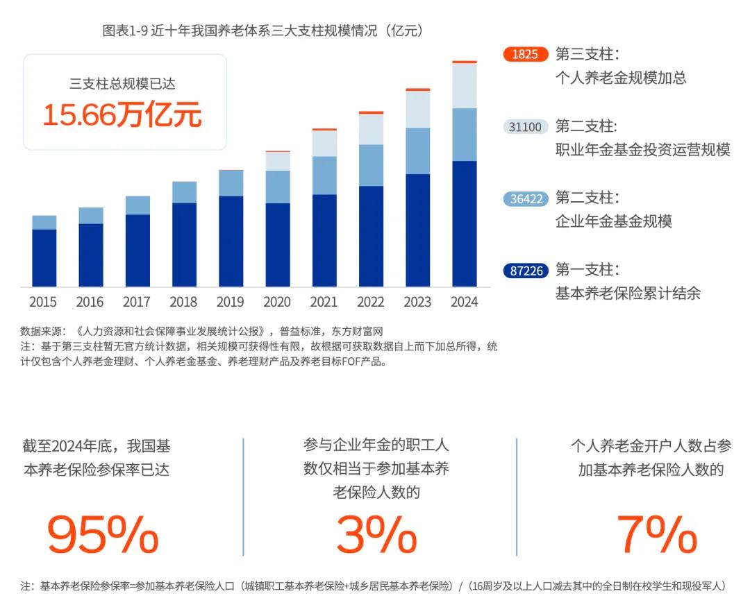 据白皮书测算显示,截至2024年底,中国养老金三支柱总规模为15.66万亿元,占GDP比重不足12%,远低于美国160%的水平。