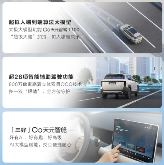 在辅助驾驶领域,纳米06带来了真正的"科技平权"。天元智驾T100系统的高快领航NOA功能,支持导航变道和效率变道,大弯曲率匝道通行能力以及99%的上下匝道成功率,这些原本只在高端车型上出现的功能,如今在纳米06这种10万级车型上得以实现。
