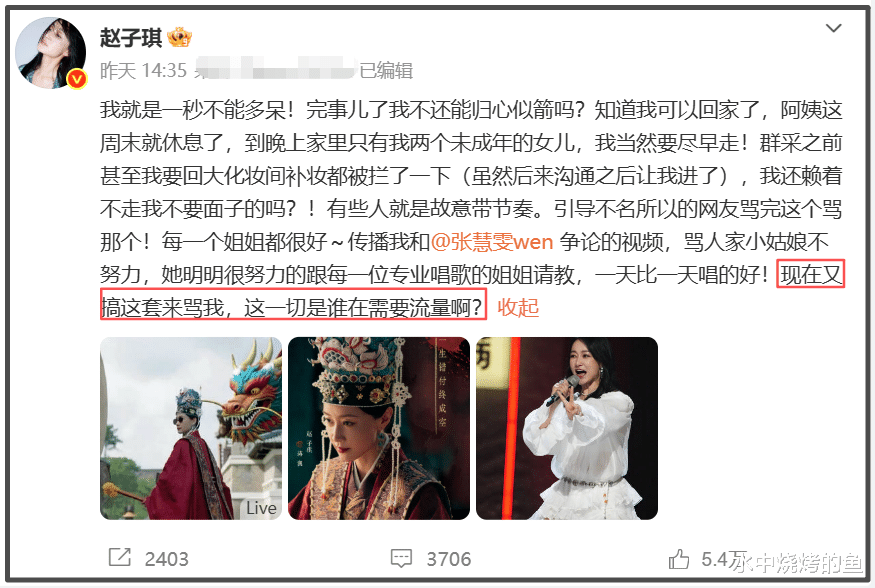 抓马的事情还不止这么多,赵子琪日前又在社交媒体发文,这一次直接火力全开,把矛头指向了节目组。