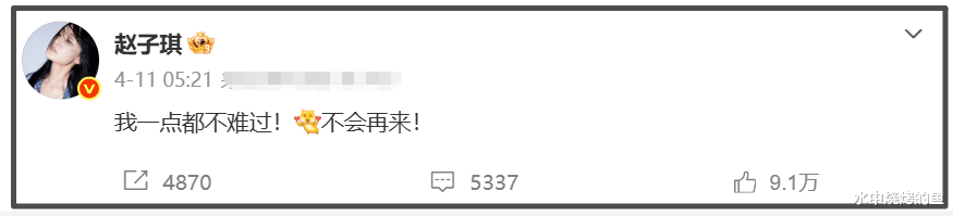 赵子琪被淘汰后,就在社交媒体发文:我一点都不难过,不会再来。前半句听着还没什么问题,这后半句怎么分析怎么不对劲儿。要知道,《浪姐》每季节目淘汰姐姐都会返场的,赵子琪这是直接把后路都堵死了。