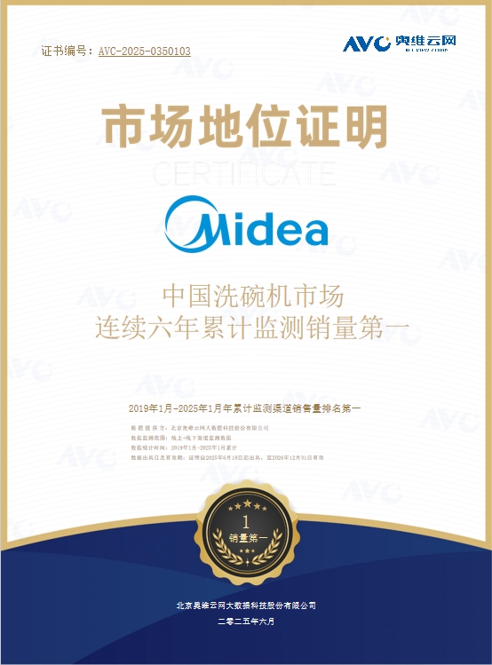 近日,在奥维云网(AVC)举办的2025中国洗碗机产业五年300亿计划助推峰会上,美的洗碗机凭借全渠道持续领跑的市场表现,荣获“中国洗碗机市场连续六年累计监测销量第一”认证。这一荣誉的背后,不仅是行业对美的洗碗机的高度肯定,更彰显了其硬核科技实力。