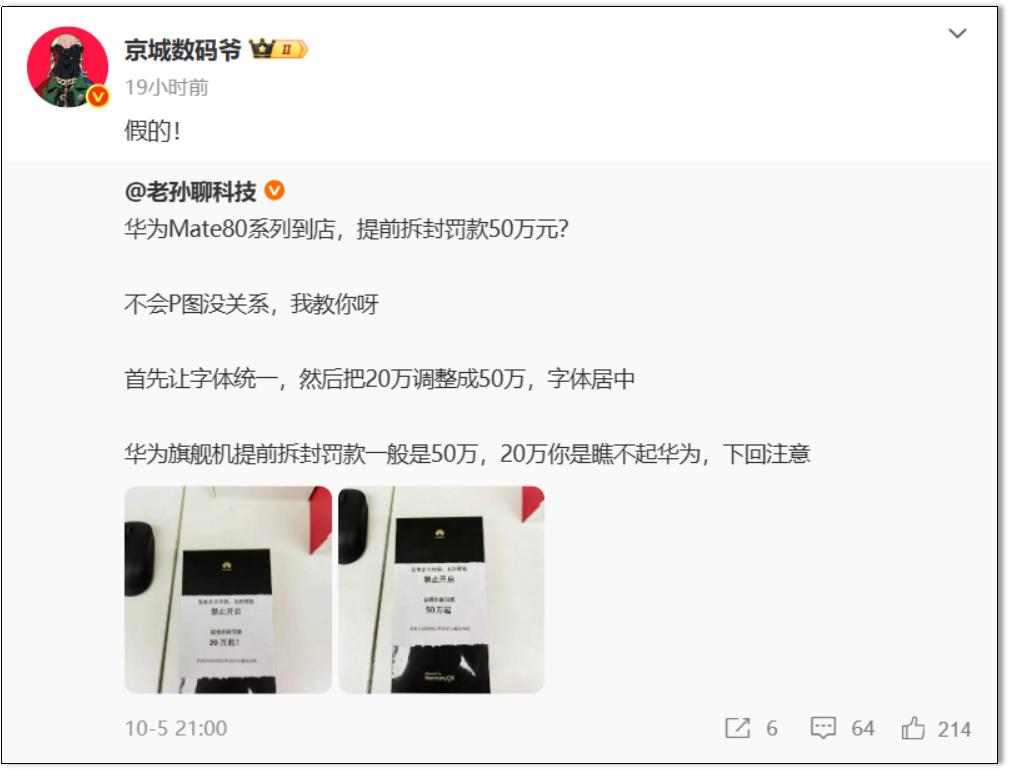 消息传出后,众多网友质疑旗舰机型为何会提前数月现身市场。鉴于官方至今未公布Mate 80系列具体信息,此时出现所谓"真机包装"确实令人起疑。另一位数码博主直接指认这些图片系伪造,虽未详细说明,但强调相关消息未经官方证实且存在疑点。
