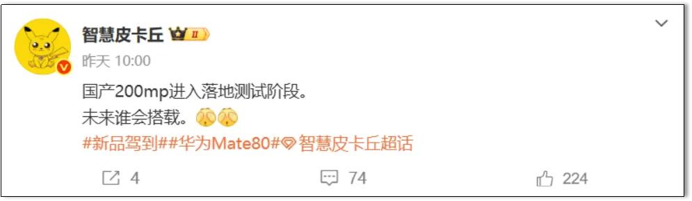与此同时,数码博主智慧皮卡丘爆料,华为Mate80系列将上2亿像素镜头。其通过微博表示:“国产200mp进入落地测试阶段。未来谁会搭载。#新品驾到##华为Mate80#”