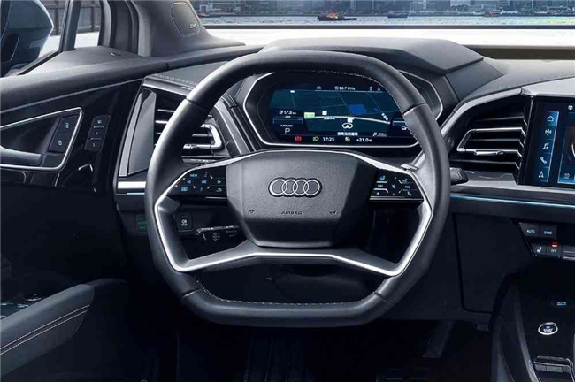 空调出风口造型独特,内部采用更细致的设计,外围是银色圈环绕金属,看起来真的很不错。中控台表面都加入软性材质包裹,毕竟Q4 e-tron售价也摆在那里。方向盘配备有换挡拨片,在辅助驾驶方面搭载了360度全景影像。