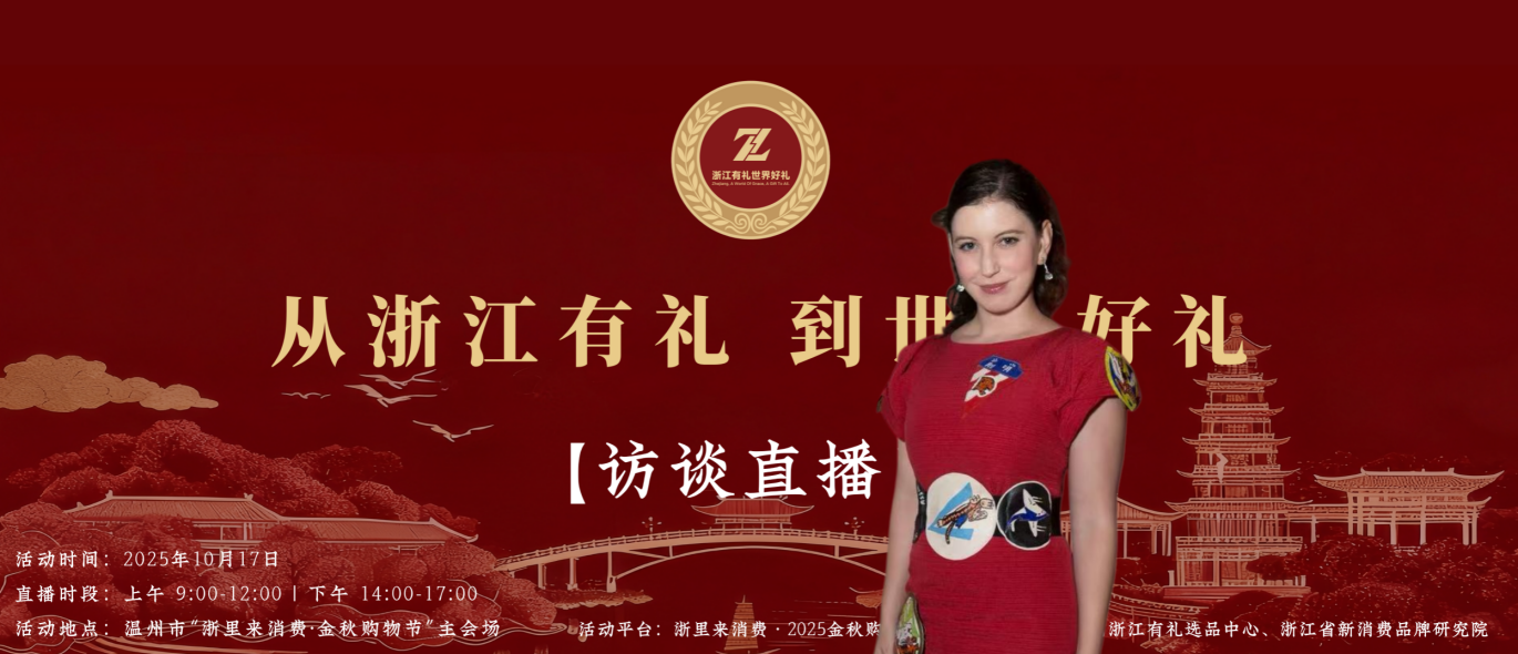 这场 “浙江有礼・世界好礼” 访谈直播,既是一次浙江品牌的集中亮相,也是一场文化与消费的深度对话。通过镜头,观众不仅能 “云逛” 金秋购物节,解锁浙江好物,更能深入了解浙江品牌背后的文化基因与创新精神,见证 “浙江有礼” 如何从文明理念转化为走向世界的优质产品。10 月 17 日,锁定 “浙江有礼・世界好礼” 直播间,跟随郝凯瑞(Kerry Berry Brogan)一起对话 11 位有礼的文化人和企业家,探寻浙江消费新潮流,感受中国品牌的国际魅力!(陈涵)
