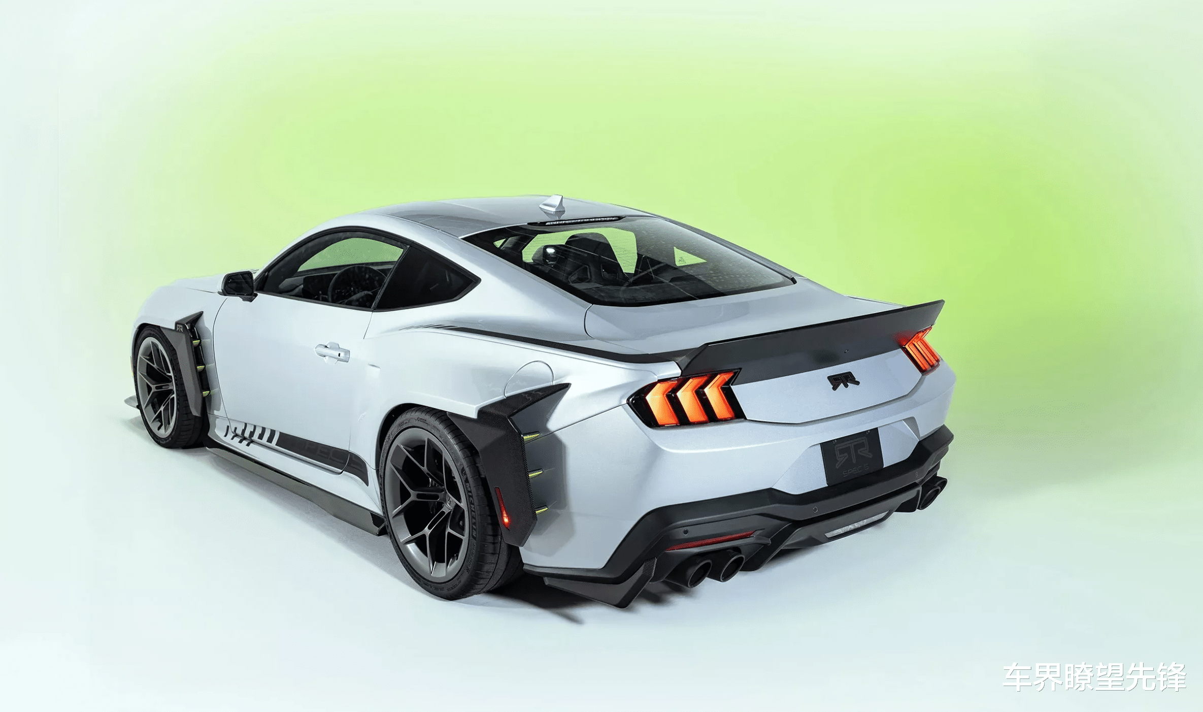 Spec 5 Mustang配备了宽体套件,包括全新设计的挡泥板、保险杠延伸件、复合材料的摇臂板、通风引擎盖、发光格栅、碳纤维的前分流器、碳纤维的侧裙、碳纤维的尾流塔以及特殊的徽章等,整车看上去更加的炫酷,充满力量感。