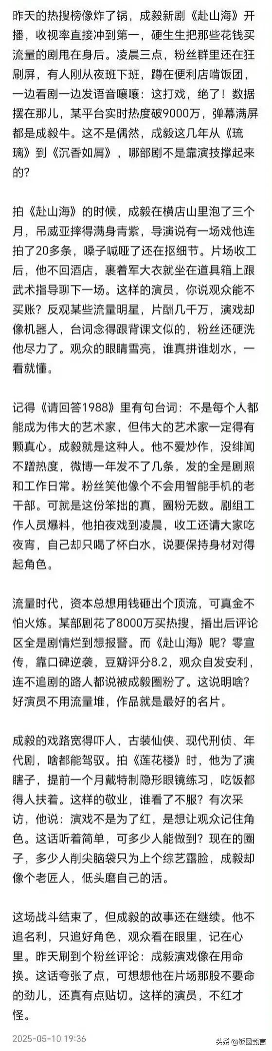 这是官媒与成毅的公开交流,目的非常明确:德艺双馨的演员不能被饭圈舆论抹杀!