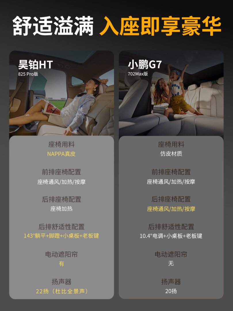 昊铂HT在细节上很懂用户痛点:NAPPA真皮座椅全系标配,夏天透气、冬天不冰屁股;电动遮阳帘一键开合,烈日下不用手忙脚乱贴遮阳膜。更不用说8155芯片+5G网络这对组合:导航、听歌、刷视频都能“秒响应”,等红灯时再也不用对着转圈圈的屏幕干着急。而小鹏G7在智能生态上虽有亮点,但若论“入门即享豪华”,昊铂HT显然更舍得给。