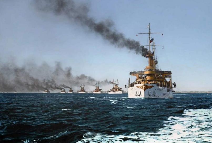 在硬实力上,凭借着美国庞大的体量和工业革命带来的红利,美国海军天然就拥有着极其强大的物质基础。在20世纪初,他们就武装起了规模庞大,拥有多达16艘战列舰的“大白舰队”进行了全球游行。