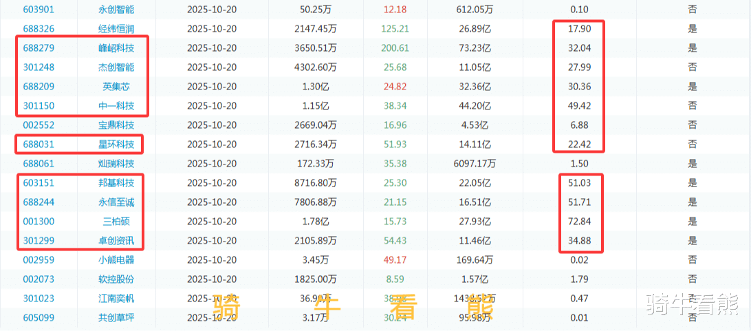 10月20日(周一)峰岹科技解禁比例达到32.04%;杰创智能解禁比例达到27.99%;英集芯解禁比例达到30.36%;中一科技解禁比例达到49.42%;星环科技解禁比例达到22.42%;邦基科技解禁比例达到51.03%;永信至诚解禁比例达到51.71%;三柏硕解禁比例达到72.84%;卓创资讯解禁比例达到34.88%。