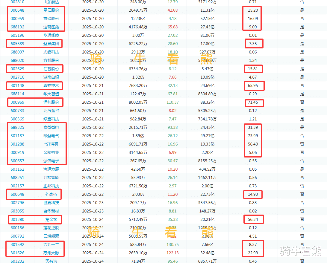 10月21日(周二)嘉戎技术解禁比例达到65.95%;恒帅股份解禁比例达到71.45%。