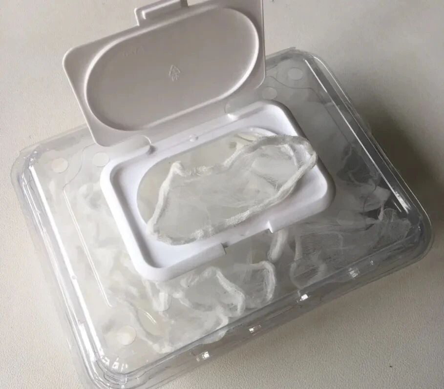 我们可以用这种水果盒搭配一个湿巾盖,就能做成一个专门的保鲜膜收纳盒。