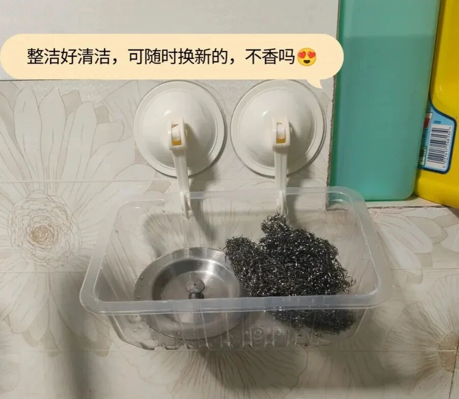 我们刷碗刷窝的时候总会用到很多清洁工具,比如百洁布,钢丝球等等。如果把他们随手放在台面上,不仅会滴水,而且还显得厨房很乱,看起来就很闹心。