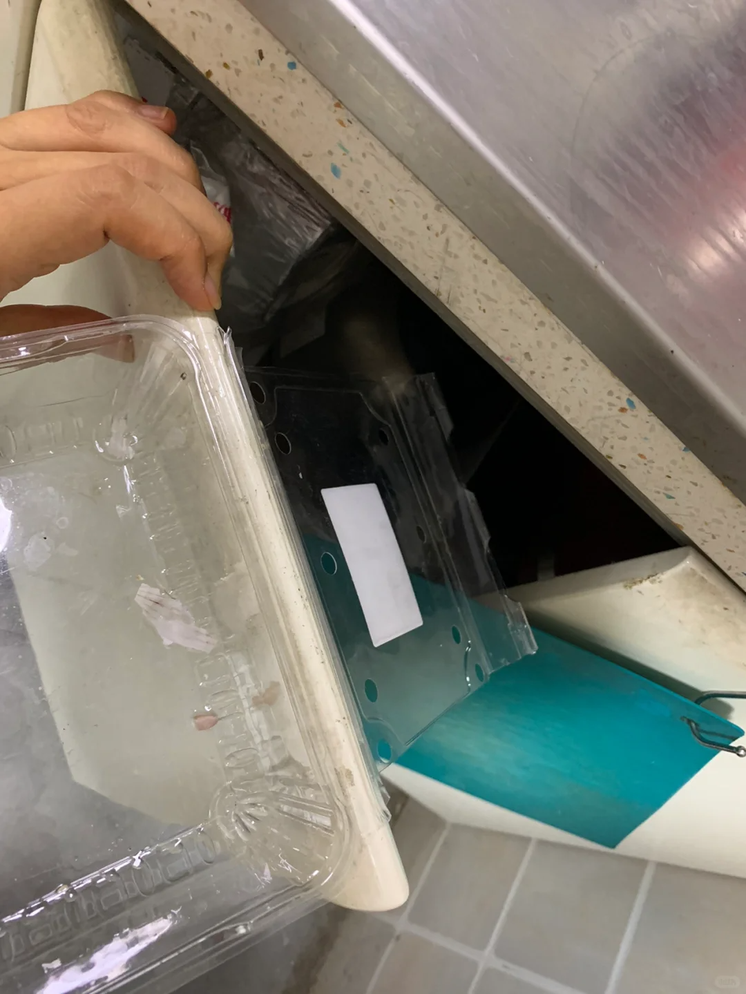 当你还没有选到合适的沥水槽时,不妨用透明的水果盒自行改造一个,不仅省钱,而且还很实用。