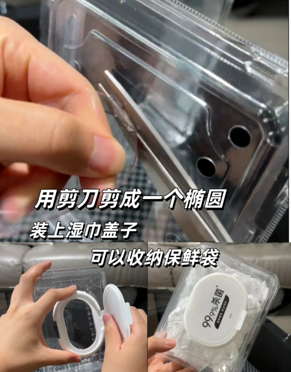 方法特别简单,只需要在水果盒盖上开出一个和湿巾盖出口差不多的洞,
