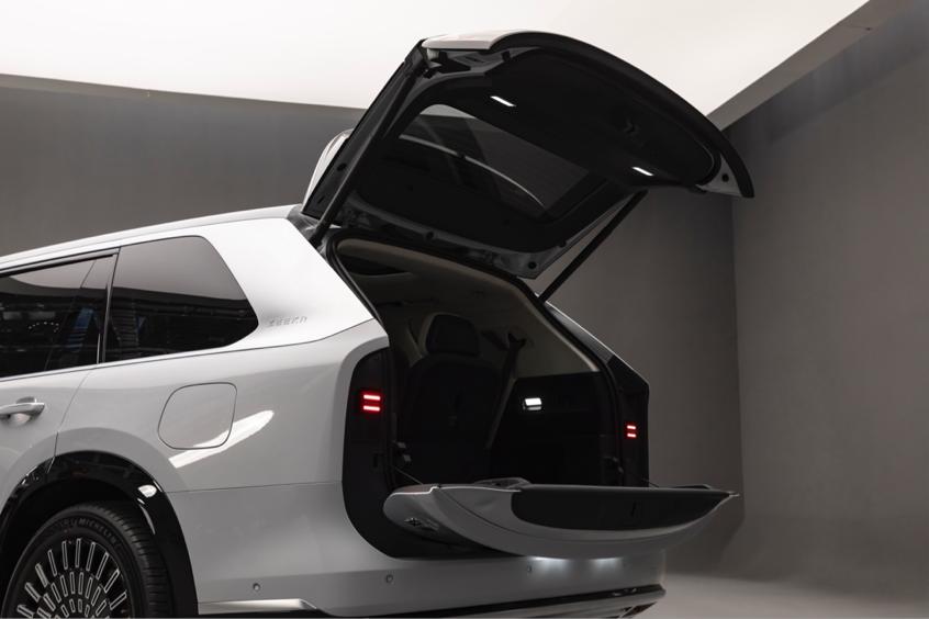 外观设计方面,极氪9X前脸采用超大面积的一体式格栅,底部借鉴古代宫殿台基设计;车头两侧配备双百万像素智能投影大灯,单灯像素达130万,还支持“龙行天下、凤来仪”迎宾光毯及多场景互动,很有辨识度。值得一提的是,极氪9X全系标配电动天地门,地门承重可达300公斤,实用又大气。
