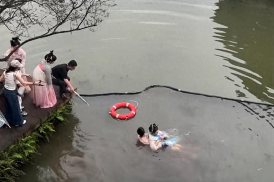 据介绍,事发后落水游客和救人者均自行离开现场。景区调取事发现场附近监控视频,发现救人男子在下水前,将手中相机交给了旁边的人,因此景区分析他是一名摄影师。但景区工作人员找遍了古镇旅拍店,均未找到该人。因此不排除是自带相机的游客,或者是落水游客自带的摄影师。
