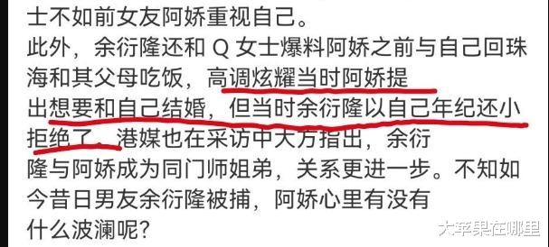 余衍隆还向Q女士透露了他和阿娇的“暧昧”,包括阿娇向他求婚、带他去吃美食等细节。