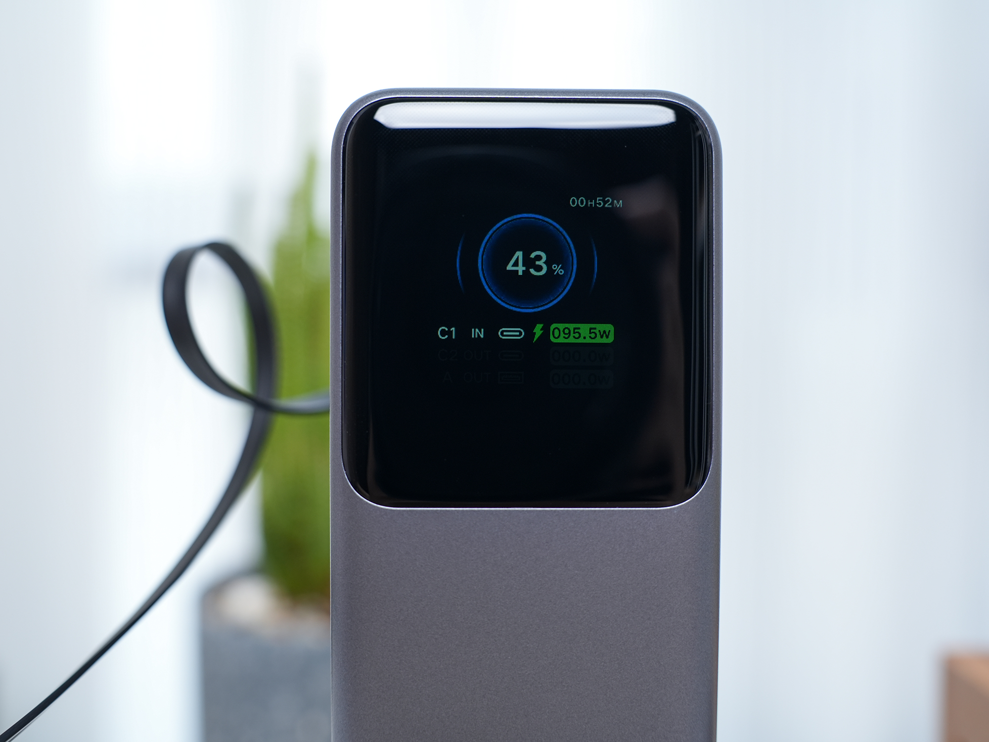 绿联能量湃Pro不仅给其他设备速度快,自充电也很快,搭配100W充电器最高充电功率可以达到95W左右,基本上一个半小时就可以把充电宝充满,这样的速度在旅行中非常好用,不像之前使用的2W毫安充电宝需要两三个小时才能充满,不会耽误旅行途中的使用。