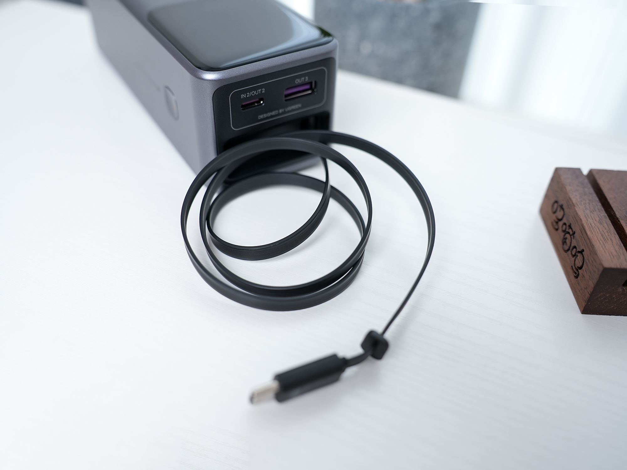 绿联能量湃Pro这款产品最具辨识度的设计莫过于顶部集成的可伸缩充电线设计,它很好的解决了外出时忘带数据线的情况,伸缩线的接口部分有磁吸结构,收起来后可以贴合卡槽,也不会轻易弹出。