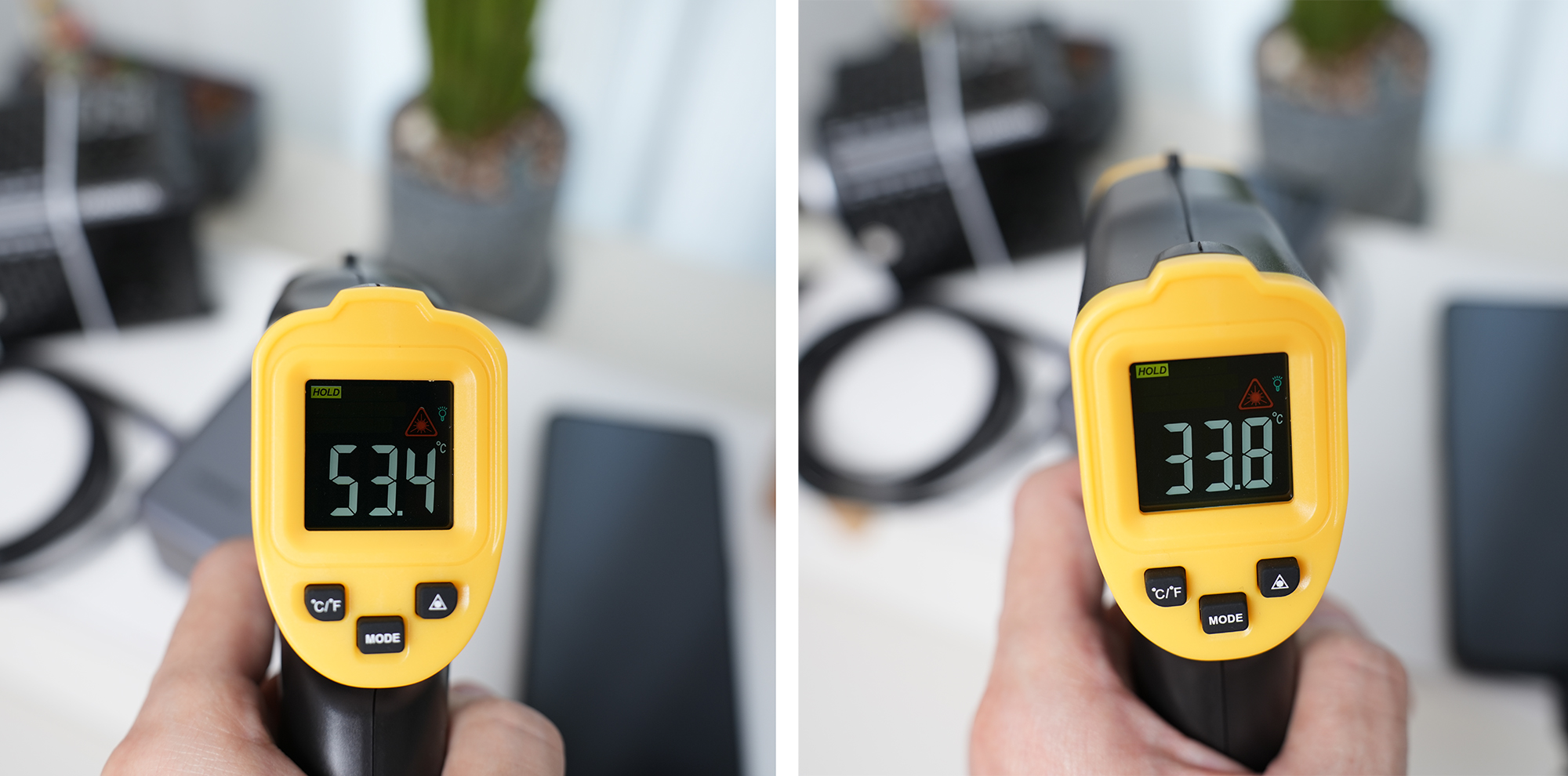 充电宝的发热情况,室温27度左右,USB-C2接口以80W左右持续输出20分钟,充电宝最热处为接口面板,温度53度左右,充电宝机身部分温度33.8度,除了接口位置,外壳大部分在温热的状态,不会出现长时间大功率输出机身烫手的情况,得益于绿联的自研控温系统和大面积散热片的组合,整体发热控制还是挺不错的。