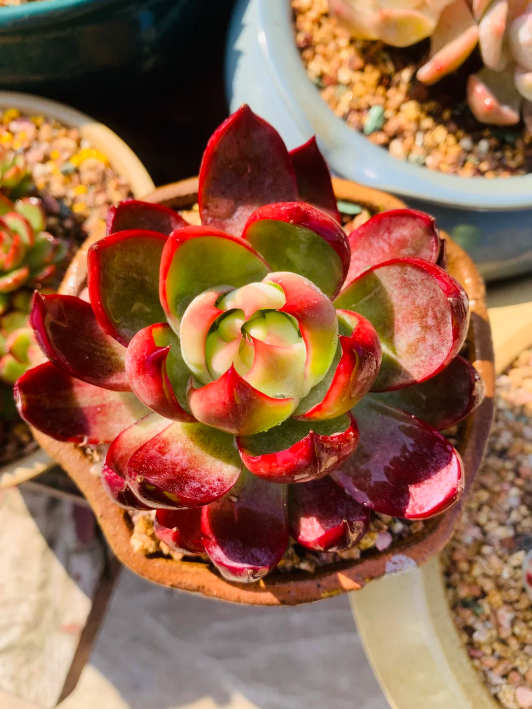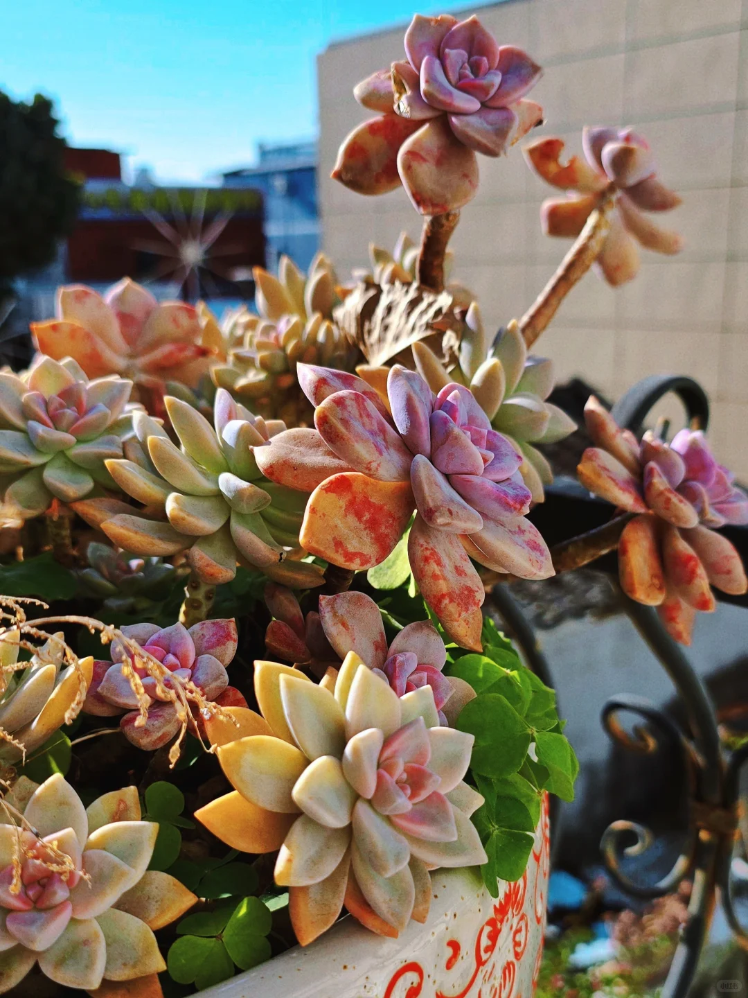 看看,屋顶摆满了各种多肉,一个挨着一个,没有任何的遮挡物,叶片却被染上了漂亮的糖果色,比花卉市场卖的还好看。