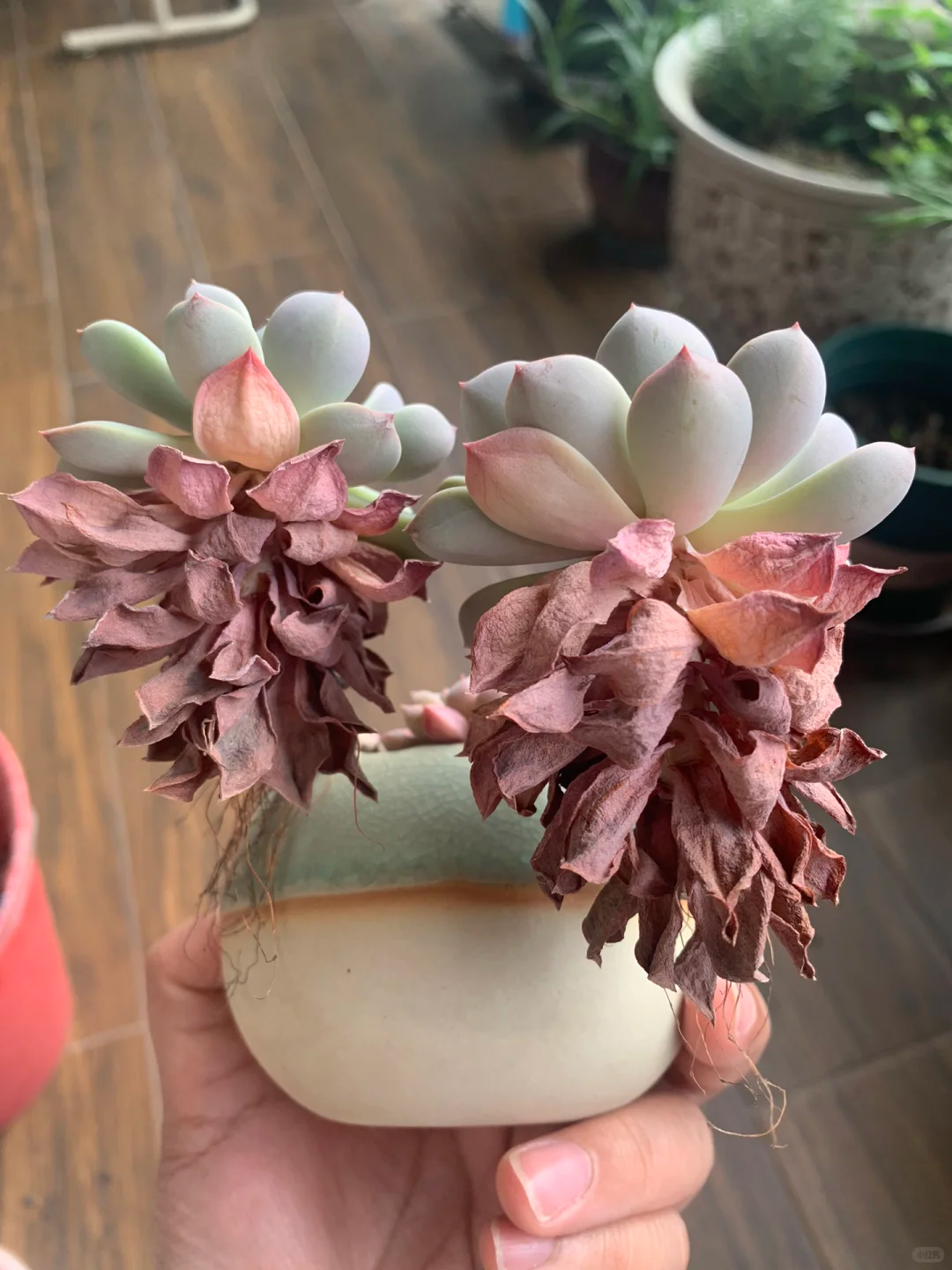 一定要记住,“宁可少浇水,也不要多浇水”,少浇水,多肉还有“求救”的机会,而浇水多了,植株分分钟就会烂根化水,特别是在高温的夏季。