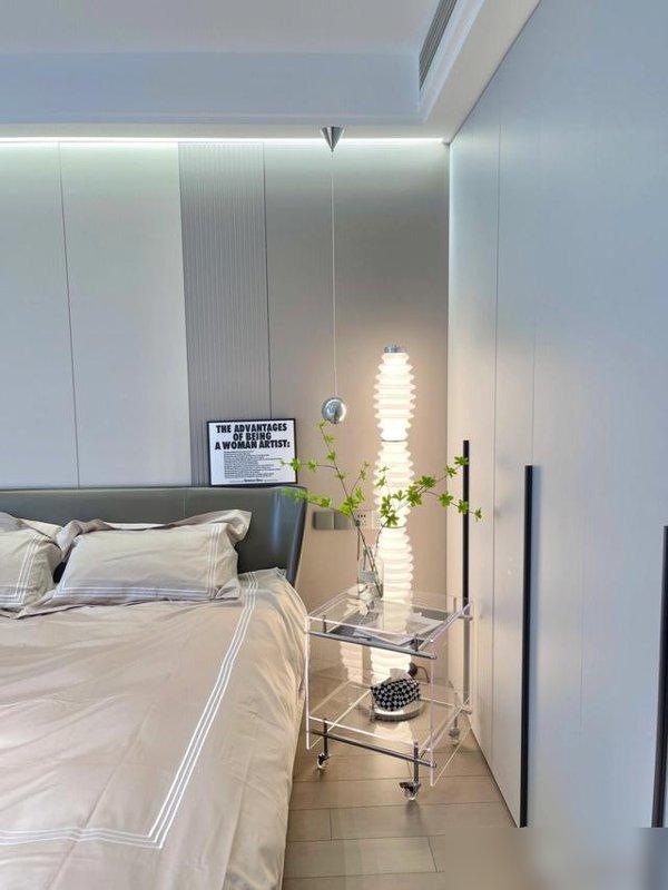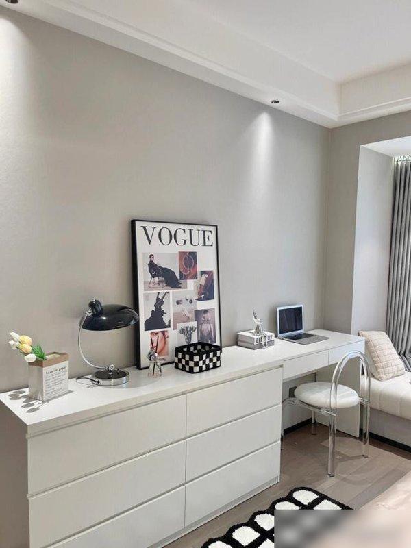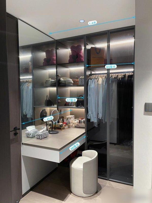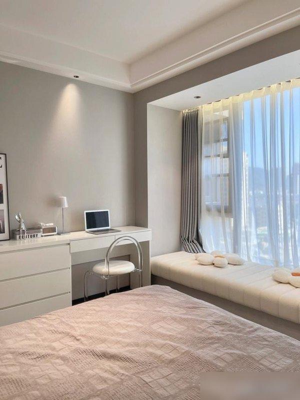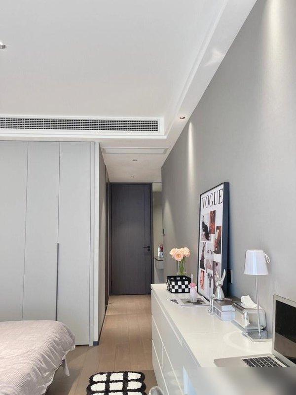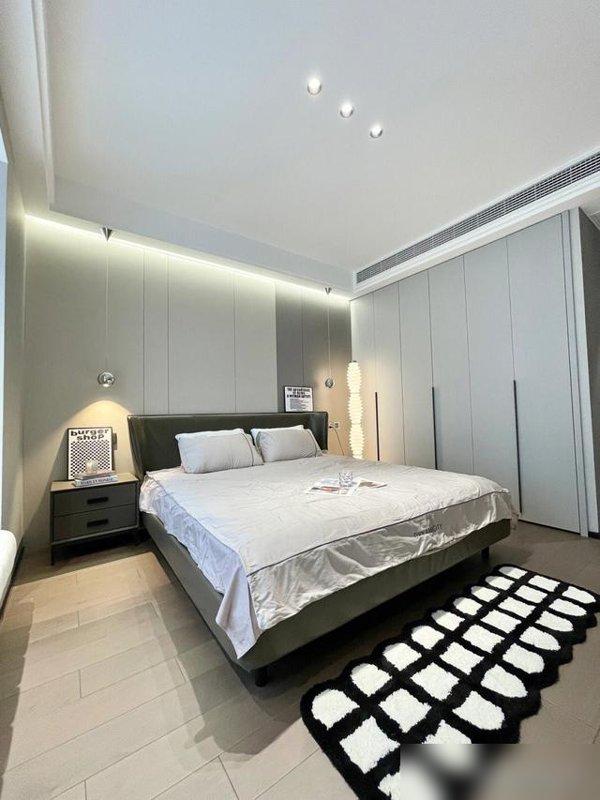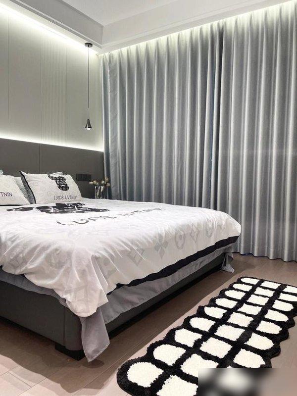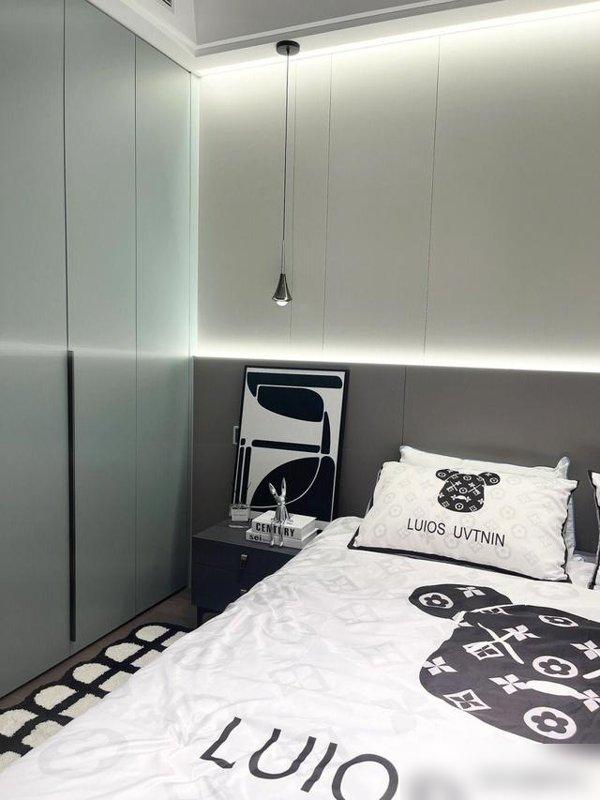 卧室的设计更懂生活:主卧硬包背景墙没做多余造型,却比刷乳胶漆有质感,一门到顶衣柜装下四季衣服,不用把厚被子塞床底;床尾的一体化梳妆台+储物柜,化妆品摆得整整齐齐,早上化妆能照到飘窗的自然光;次卧床头墙用了两层墙板,下层嵌了灯带,晚上起夜不用开大灯,光从墙里渗出来,暖得像有人留了盏灯等你;衣帽间虽小,L形玻璃柜却装得下所有衣服,悬浮梳妆台省空间,化妆的时候能看到自己的影子,比挤在卫生间化妆舒服多了。