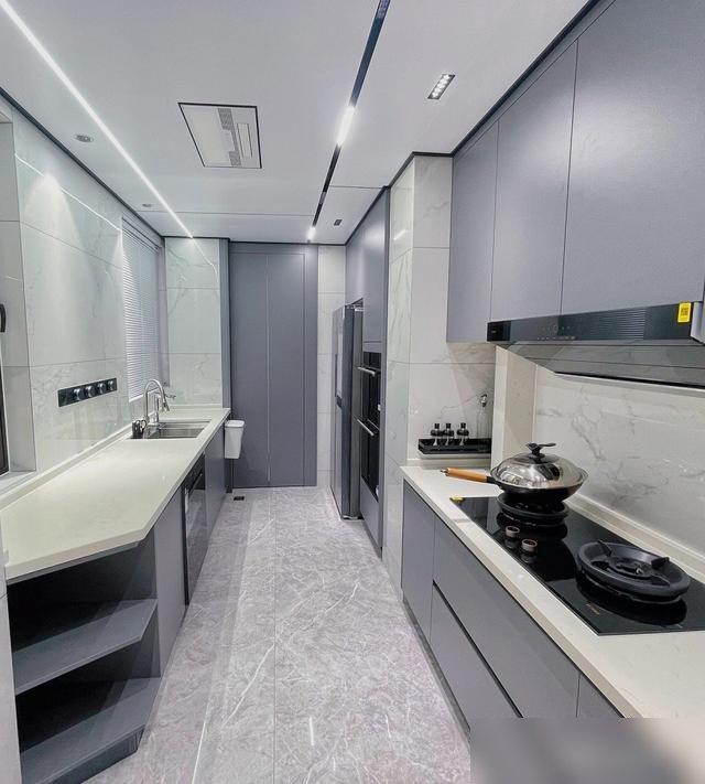 厨房U形布局把狭长空间用到极致,嵌了冰箱和蒸烤箱,免拉手橱柜不会撞胳膊,爵士白墙砖衬得厨房亮堂堂的,做饭的时候看一眼墙面,都觉得菜炒得更香了。