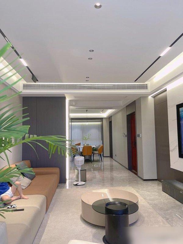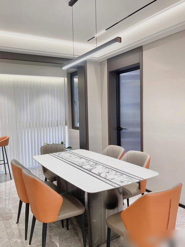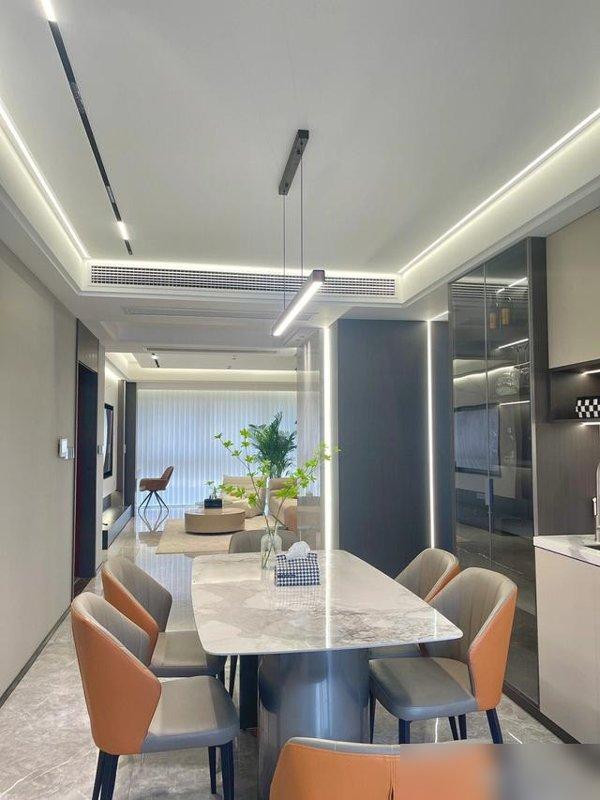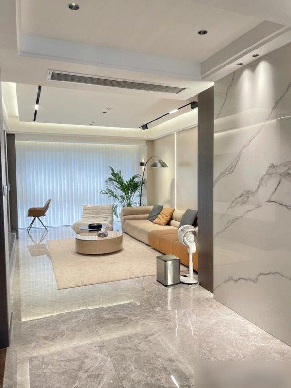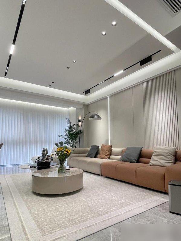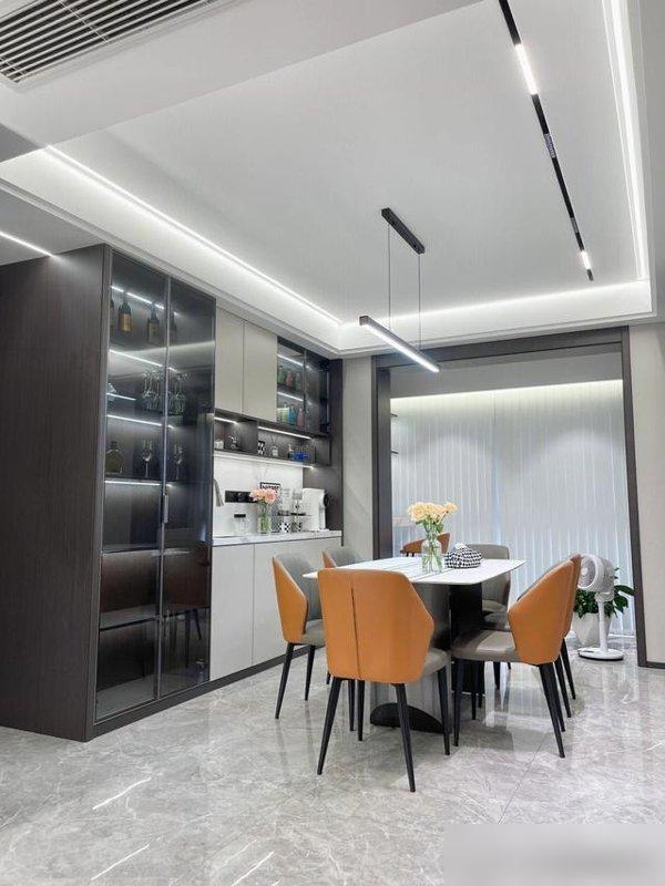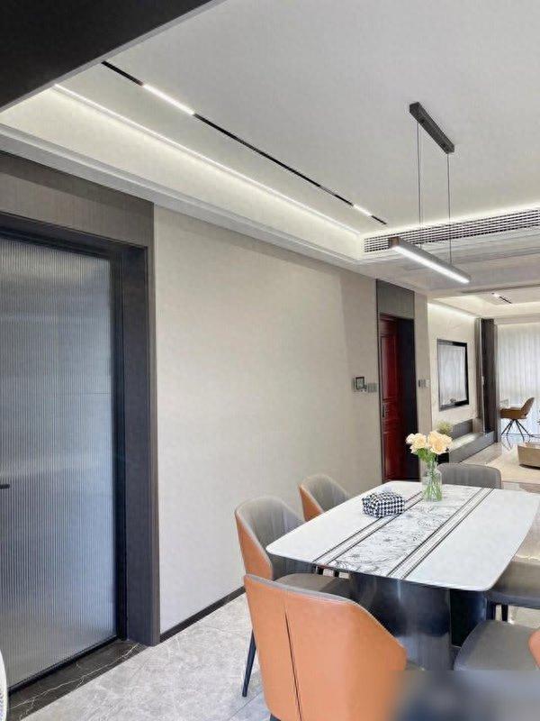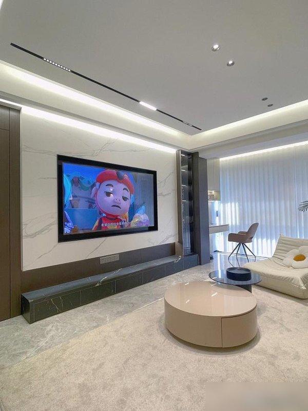 进了门更惊艳:客厅瓷砖通铺到阳台,没留半条过门石缝——打扫的时候不用蹲在地上抠水泥,吸尘器推着走一圈就干净;悬浮式平顶装了无主灯,晚上开着间接光,窝在拼色沙发里追剧,光柔得像给眼睛盖了层绒布,比那种大吊灯晃得人睁不开眼强一百倍;电视墙用悬空岩板加落地柜,底下能塞扫地机器人,上面摆个香薰,客厅的高级感全在这些细节里。