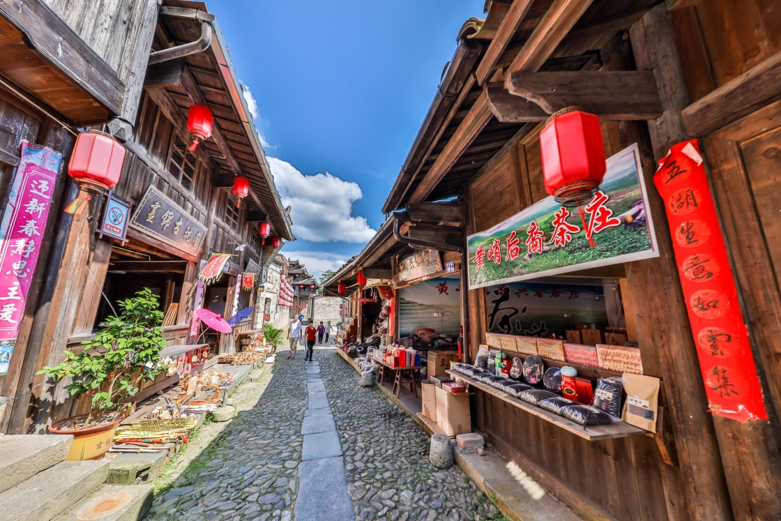 街中心全以青石板铺筑,古街两旁店铺林立,古色古香,如今依旧热闹。