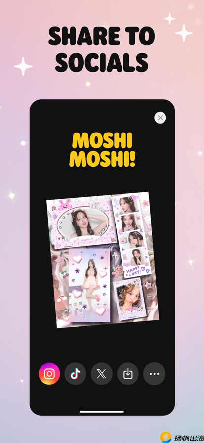 不过,想要让优质内容获得更广阔的展示舞台,仍需依托流量更大的社交媒体平台进行传播。特别是基于明星图片创作的“大头贴”作品,在主流社交平台往往能产生“破圈效应”。为此,Moshicam推出了即时分享功能,支持用户将创作成果一键分享至Instagram、TikTok、Twitter、Threads、Red Note等社交平台,实现了从创意创作、社区互动到作品分享的全链路闭环体验。