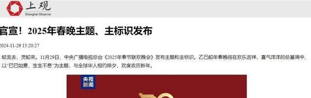2025年是农历乙巳蛇年,春晚的主题是“巳巳如意,生生不息”,意思是希望中华民族像蛇一样,机智灵活、生生不息、吉祥如意。