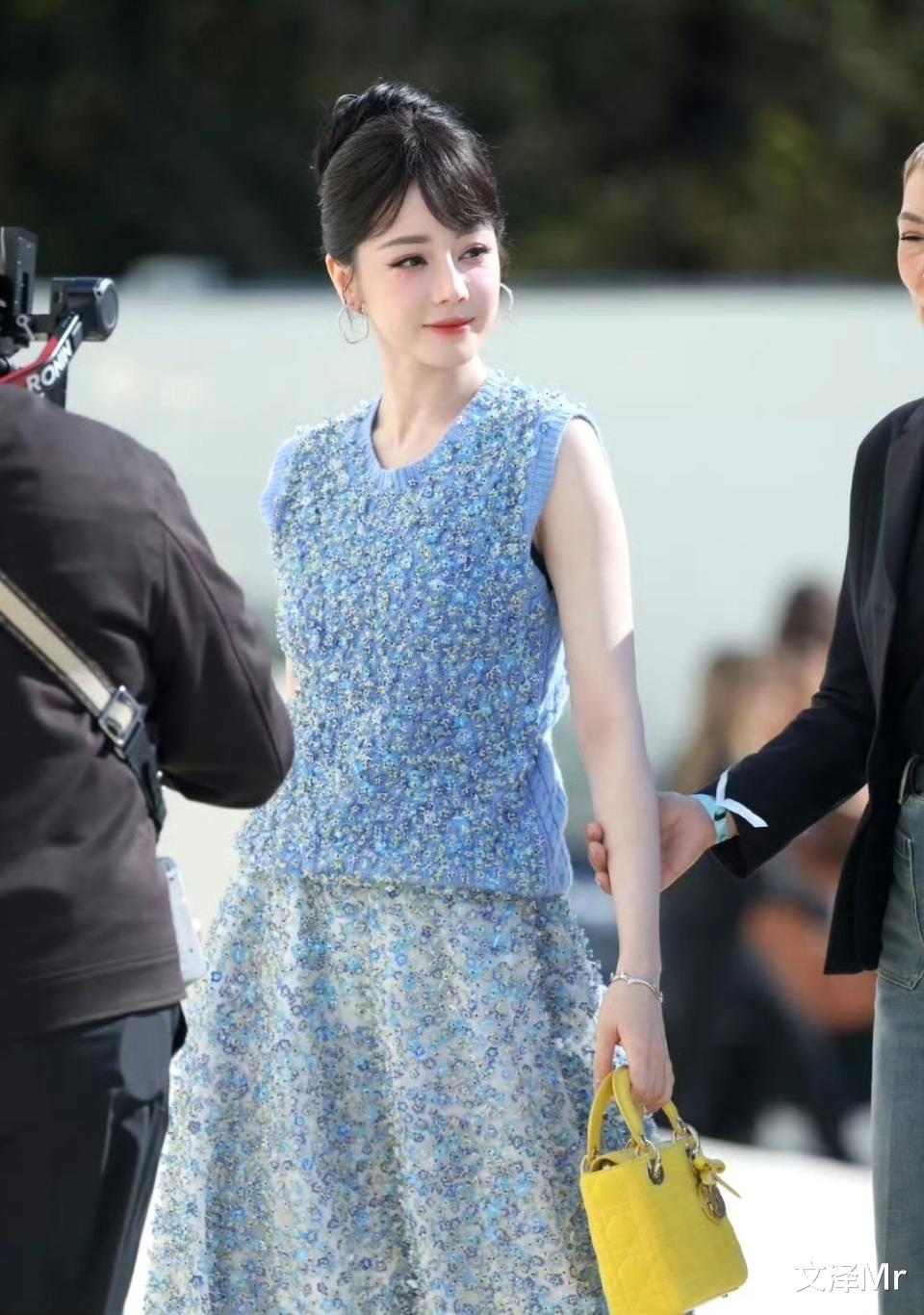 当迪丽热巴坐在秀场之中,她瞬间成为了全场的焦点。蓝色套装在她身上,多了几分庄重与时尚感。她优雅地交叠着双腿,手拎黄色手提包置于腿间,眼神明亮而自信。周围的人群仿佛都成了她的背景板,她的存在,让整个秀场都变得更加熠熠生辉。这不仅是因为她出众的颜值和身材,更是因为她由内而外散发出的强大气场,那是一种对时尚的精准把握和自信从容的态度,让她在秀场这个时尚的最高舞台上,轻松成为女王般的存在。