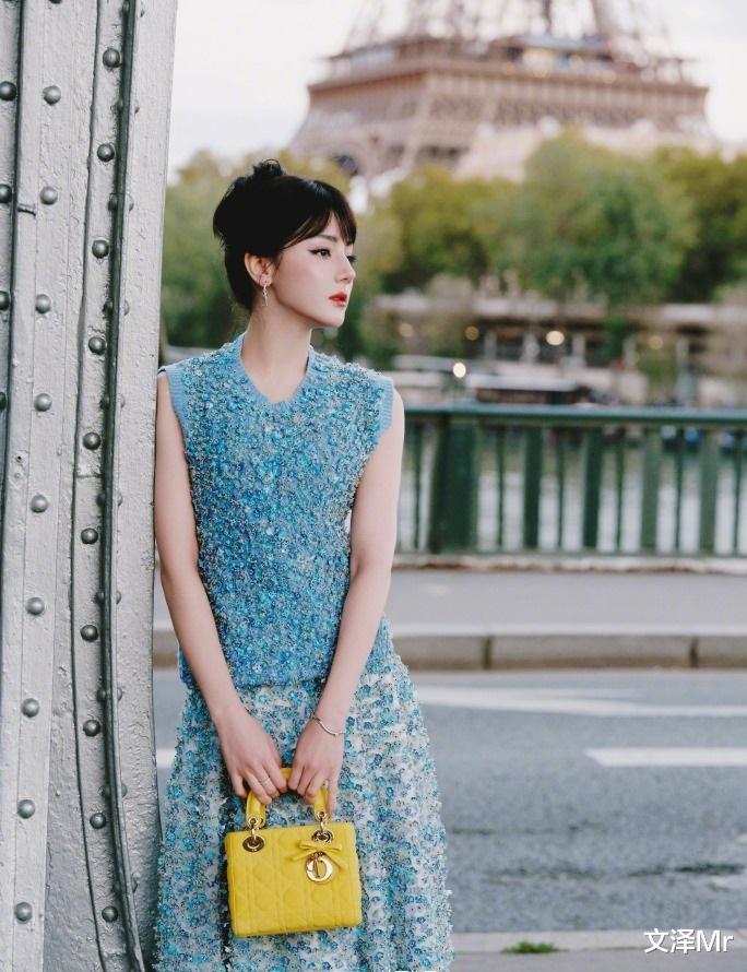 埃菲尔铁塔作为巴黎的标志性建筑,见证了无数的时尚瞬间,而迪丽热巴在这里的亮相,无疑为这座地标增添了新的时尚色彩。她依旧是那套蓝色套装,双手握着黄色手提包,站在铁塔之下。背景中的埃菲尔铁塔巍峨壮观,与迪丽热巴的时尚造型相互映衬,仿佛她就是这座城市时尚潮流的一部分,将建筑的宏伟与个人的时尚魅力完美融合。